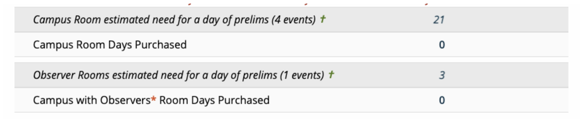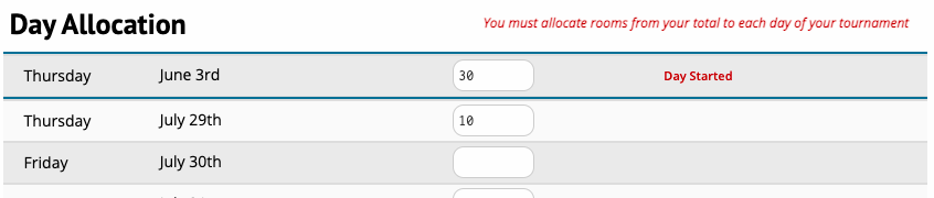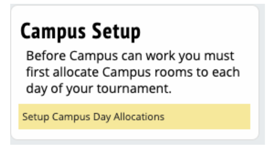 You must divide and assign the rooms as needed in the tournament setup after purchase by clicking "Setup Campus Day Allocations" on the right side of the screen at Settings > Tournament > Payment.