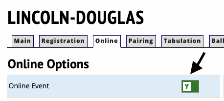 First access the tournament and click settings. Then events, the specific event, and finally the online tab.