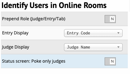 Make the appropriate selections under Identify Users in Online Rooms. This gives you the option to set how each user's name is displayed in the video room. For example, Tab - George Brown, Judge - Alana Green, or Code - Student Name. Select the option that works best for your tournament.
