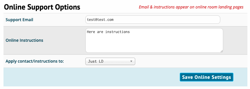 The section titled Online Support Options gives tabulation staff the ability to list email(s) and instructions that will appear on online room landing pages.