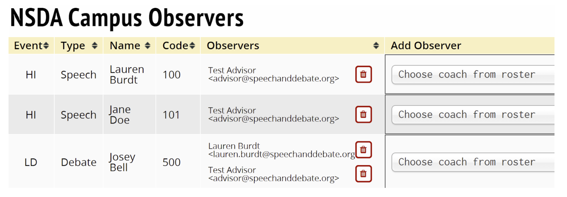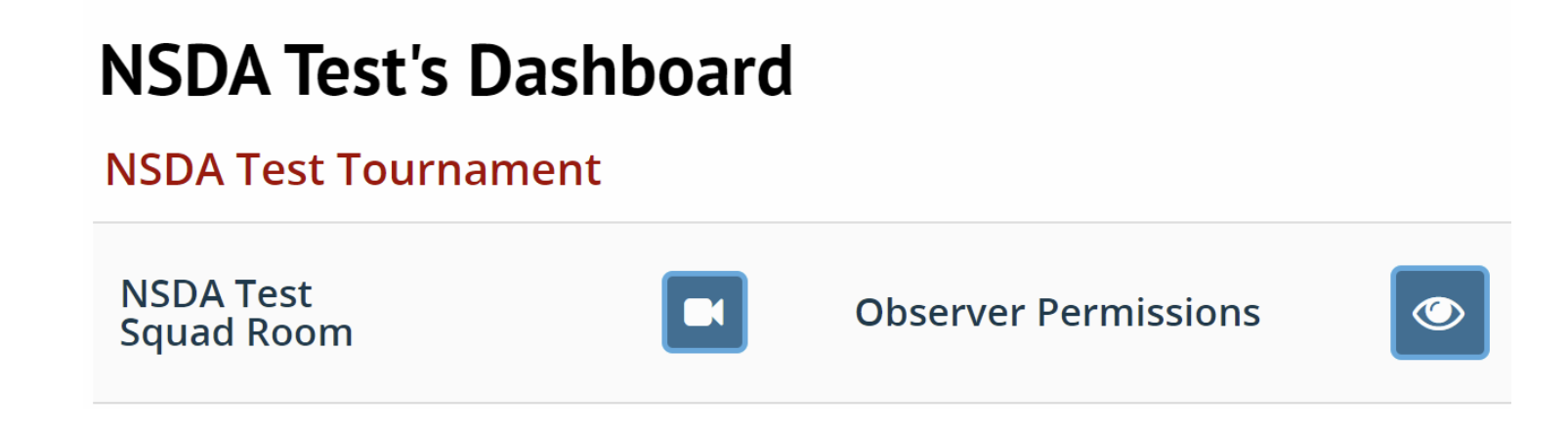 Coaches may designate observers on their school tournament dashboard on a per-entry basis. Those observers can then enter rooms from the tournament dashboard. Coaches can change observers at any time during a tournament. However, once one observer in speech or two in debate enters a room, no other coaches can enter that room for your entry, even if observer permissions are changed on the dashboard or if they leave the room.