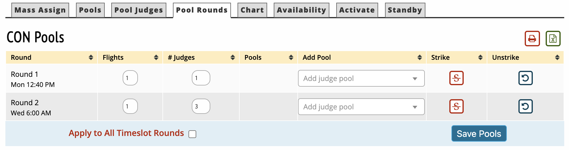 Alternate screen that allows you to assign judge pools to certain rounds of a given event instead of assigning rounds to a certain judge pool. You can also set how many flights an event round with have as well as the number of judges for each round of the event here.