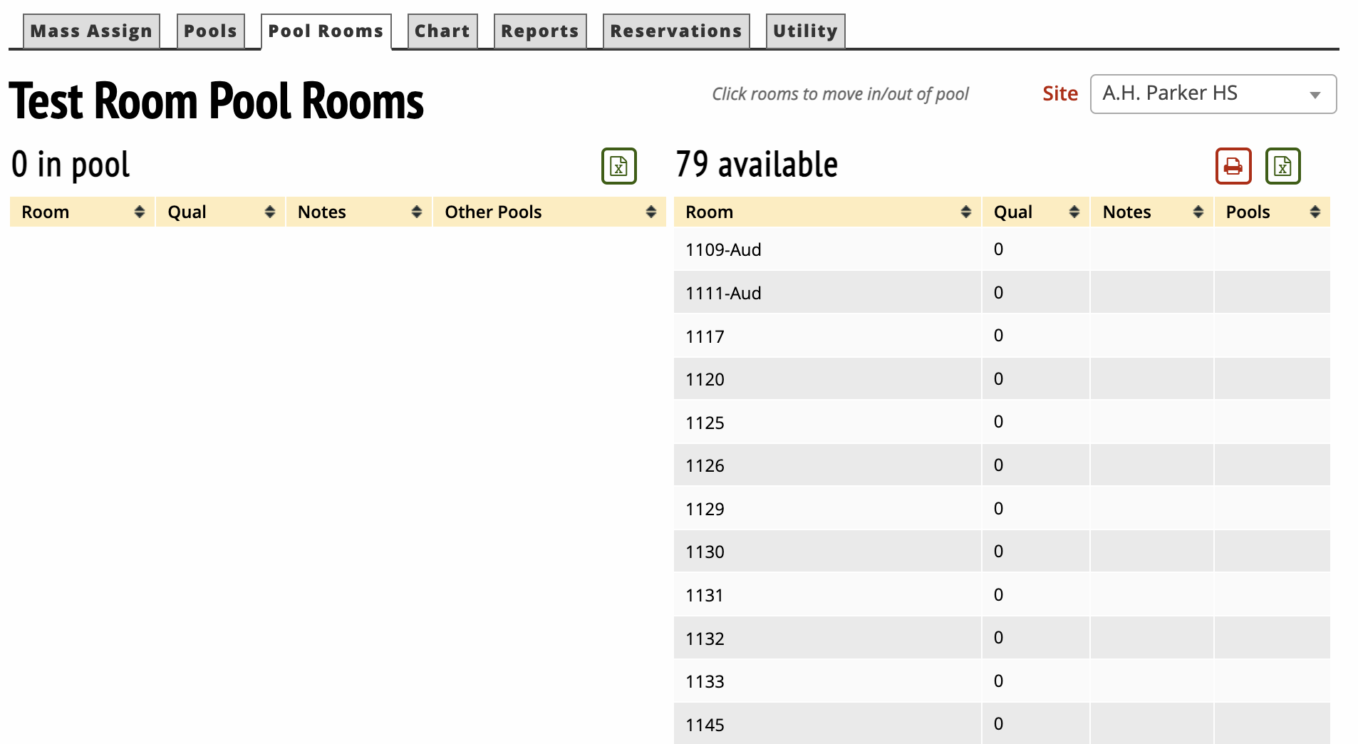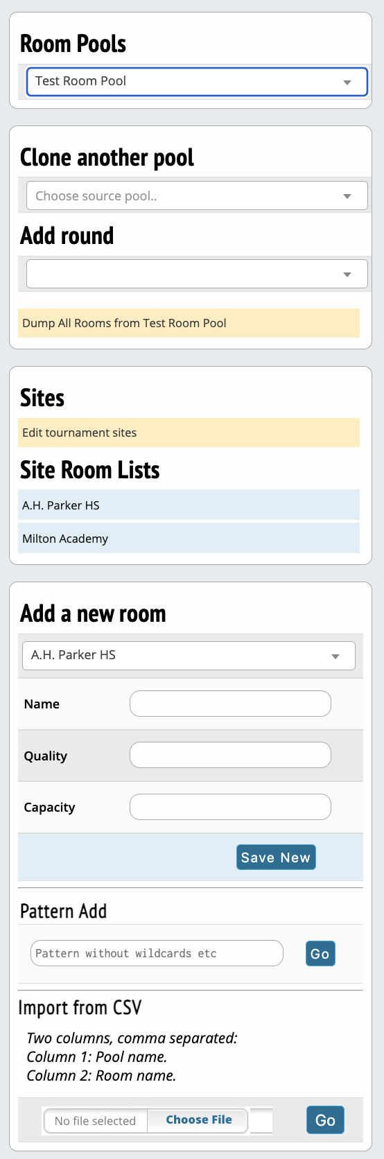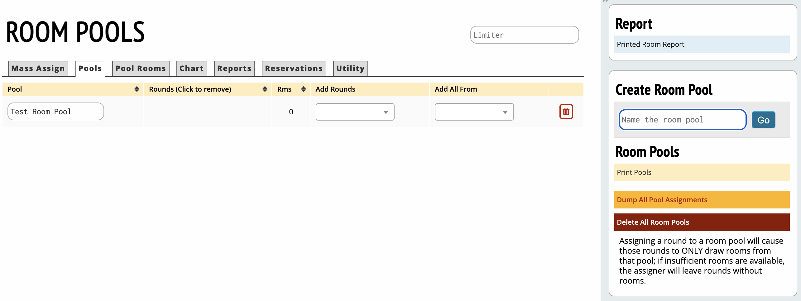 This screen displays a room pool, rounds assigned to that pool, options to add rounds to that pool and an option to add all rounds from a given event.
