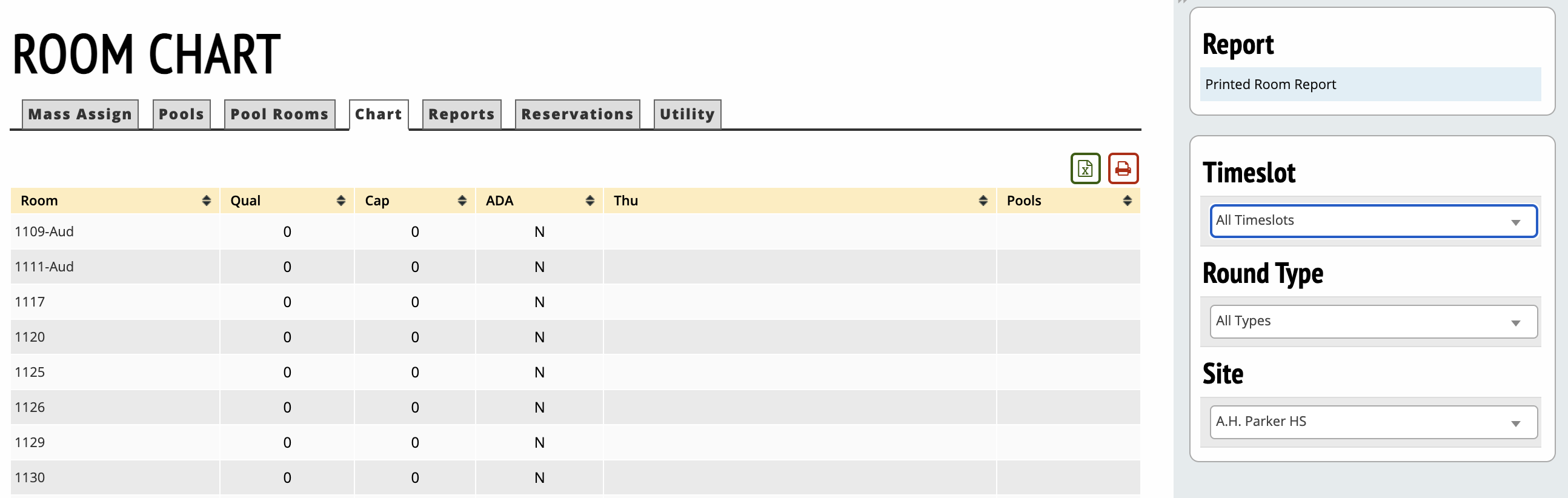 The "Chart" tab shows you a list of all rooms for the Timeslot and Site you choose.