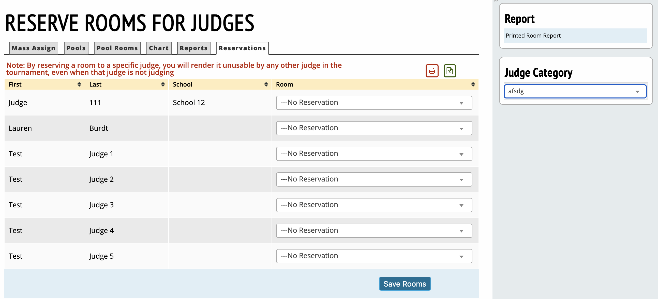Under Paneling - Rooms, the "Reservations" tab lets you assign a room to a particular judge, for example if a judge has a mobility issue and needs to stay in the same room all day. Choose a judge category from the sidebar, and then select a room to assign the judge.