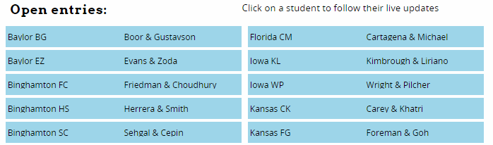 To add to your list, select an event/division of entries, a list of judges, or an entire school, then click a result to add it your list. After selecting one, you'll get a list of possible entries/judges/schools to follow, like this: