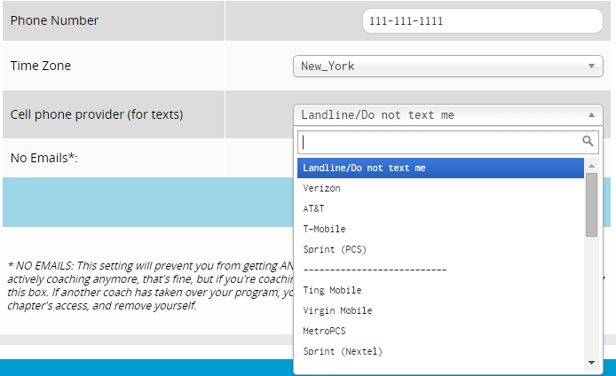 After logging in, click the "Profile" link at the top of the page, and ensure you have filled out your phone number and cell phone provider, then click "Save Changes."