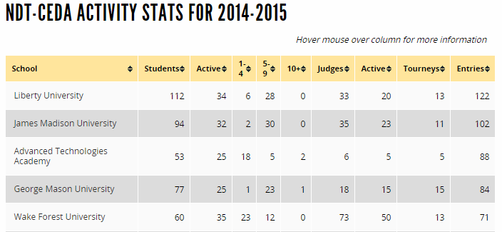 The School/Team page will further break down this information by school, showing you how many participants each school has, how many tournaments they have attended, etc. You can hover your mouse over any column name to get additional information about what it means: