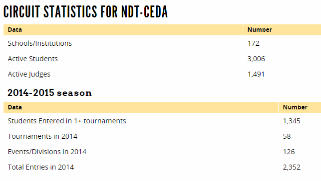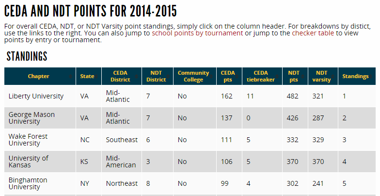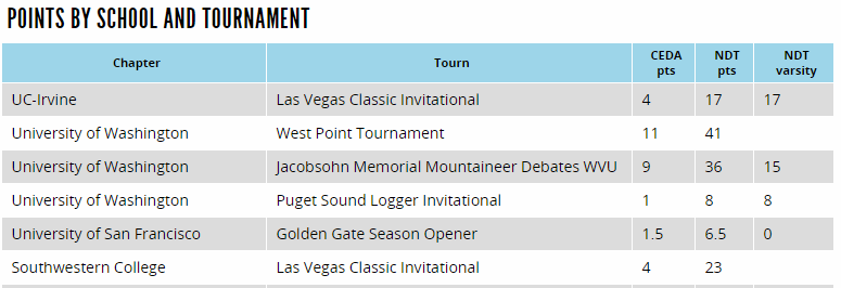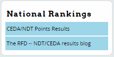 Currently, Tabroom is tracking National Rankings for NDT/CEDA. This section may have additional national rankings for other organizations in the future. Clicking the link for CEDA/NDT Points Results will show you the current standings. You can sort this table by any column you like.: