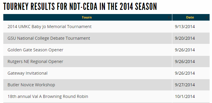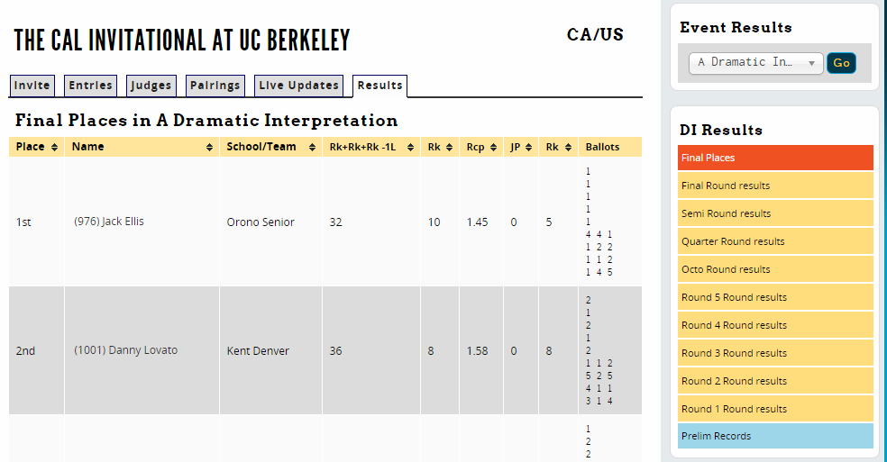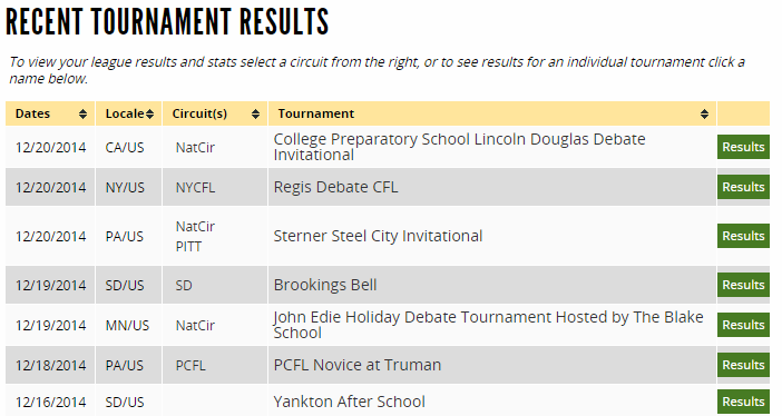 This will usually include results for each round, and frequently will include cumulative results for Final Places, Prelim Records, Speaker Awards, Cume Sheets, etc. If you do not see results that you're interested in, you should contact the tournament director.