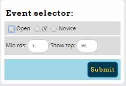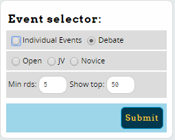 This will show the aggregated results from all teams/entries in a circuit, with stats like Total Rounds, Win/Loss percentage, Prelim/Elim Win/Loss. By default it is limited to entries with at least 5 rounds:
