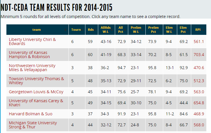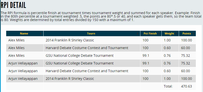 The Team (entry) Success table also includes a column for each entry's "RPI." The RPI formula is percentile finish at tournament times tournament weight and summed for each speaker. Example: Finish in the 80th percentile at a tournament weighted .5, the points are 80*.5 or 40, and each speaker gets them, so the team total is 80. Weights are determined by total entries divided by 150 with a maximum of 1.