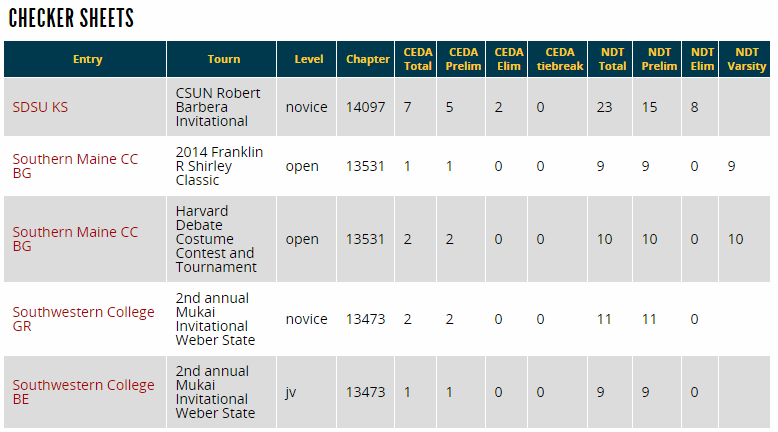 There is a separate checker sheet for each team at each tournament they have attended - clicking their name in the list will take you to their tournament result page for that tournament. If you notice a discrepancy, you should contact the tournament director.