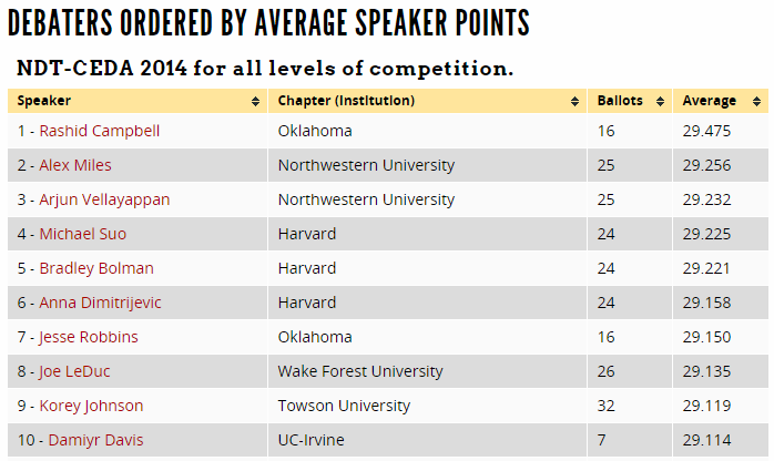 This will show you the aggregated average speaker points for the entire circuit to date, and you can sort the table based on any column: