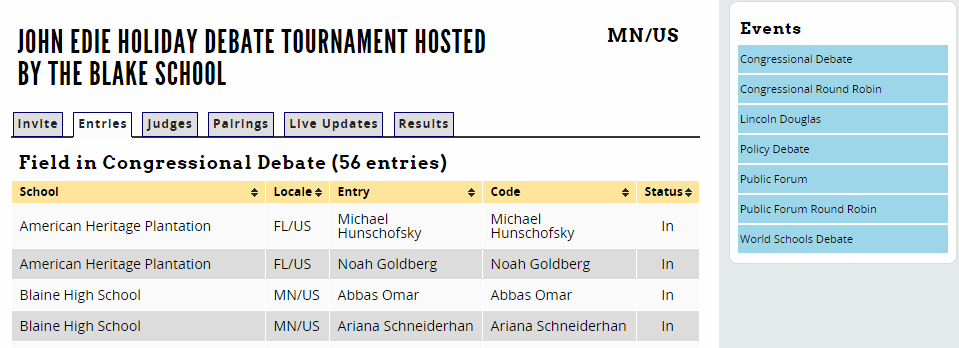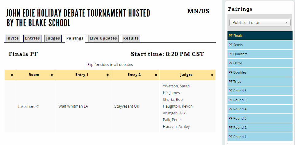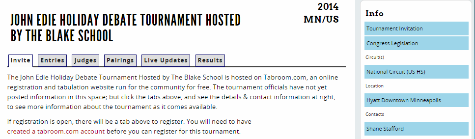 Each tournament hosted on Tabroom has its own set of public pages, which you can use to view the invitation, entries, judges, pairings, etc.