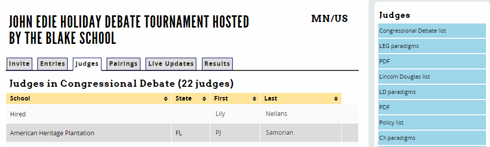 From the Pairings tab, there is a list of Judges for each event, and depending on the tournament, may be links for a list of judges obligated in the next debate: