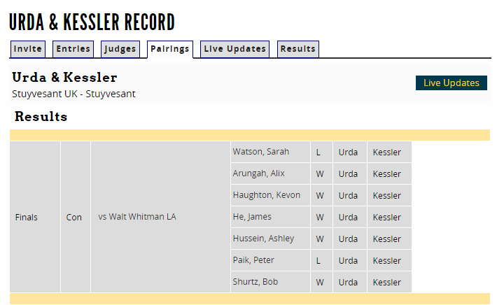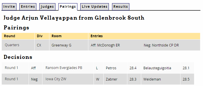 Clicking on a judge will take you to their judge record for the tournament. You can also access a judge's record by clicking their name directly from the pairing. From this page, you can see how they've voted, along with links to their full judging record and the option to follow them for live updates: