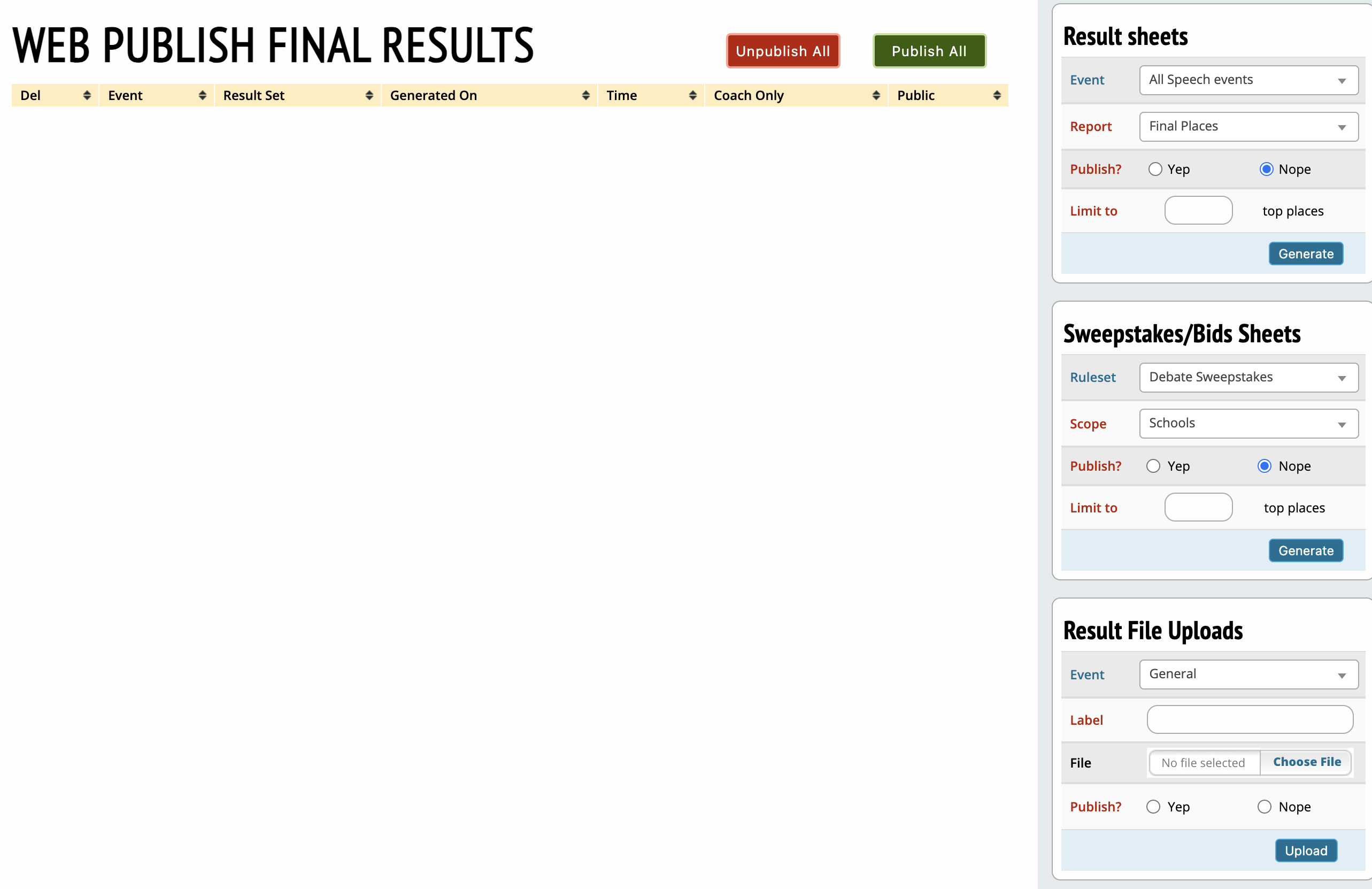 The "Web Publish" menu option lets you flexibly choose which results to make available on Tabroom. Most of the reports available in the "Reports" menu option can also be included for publishing on the web. This is also the menu option you use for uploading results if you used a different tab program to tab the tournament.