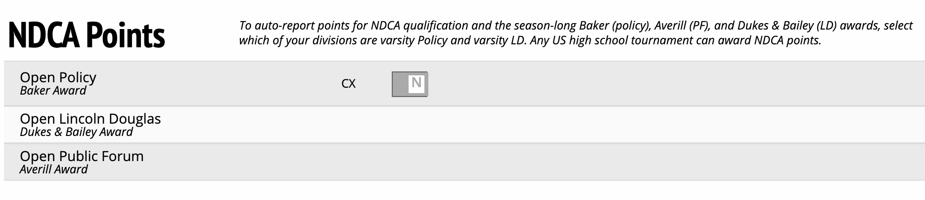 If your tournament awards NDCA points for NDCA tournament qualification or the Baker award, you can configure which divisions to auto-report