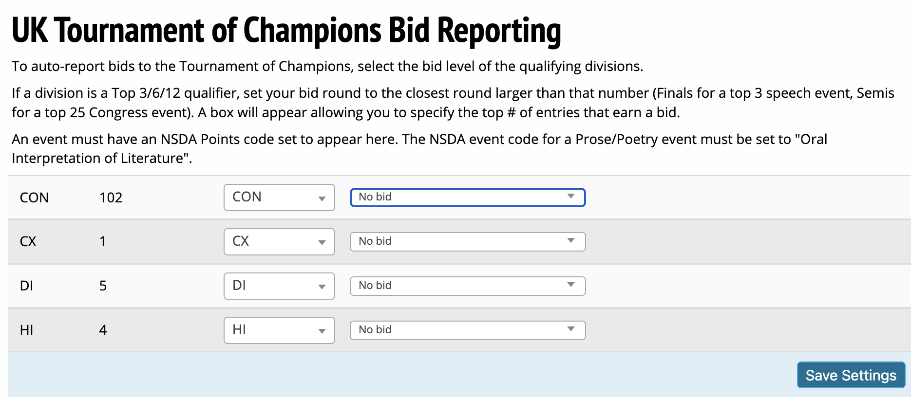 If your tournament has a bid for the Tournament of Champions, you can set the bid level for the qualifying division on the "Points & Bids" tab. You must first have configured the events and rounds in the schedule - then just select the bid level, and the results will automatically be reported to the T