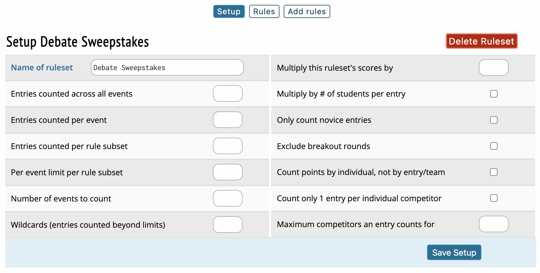 Name of ruleset This allows you to name particular sweepstakes awards at your tournament (ex: Debate Sweepstakes, IE Sweepstakes, etc).