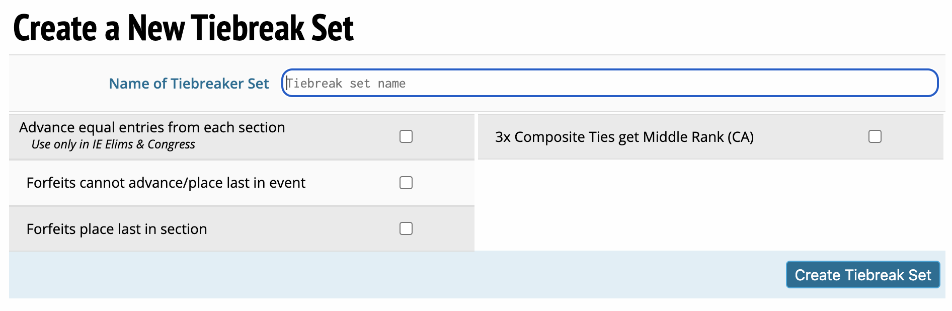 3x Composite Ties get Middle Rank (CA) - If you're using a speech ruleset like the California Plan that uses composite re-ranks (re-rank the lowest cumulative score first), this button awards entries tied in a three-way tie the middle rank. For example, three entries tied for first place would all receive a rank of 2.