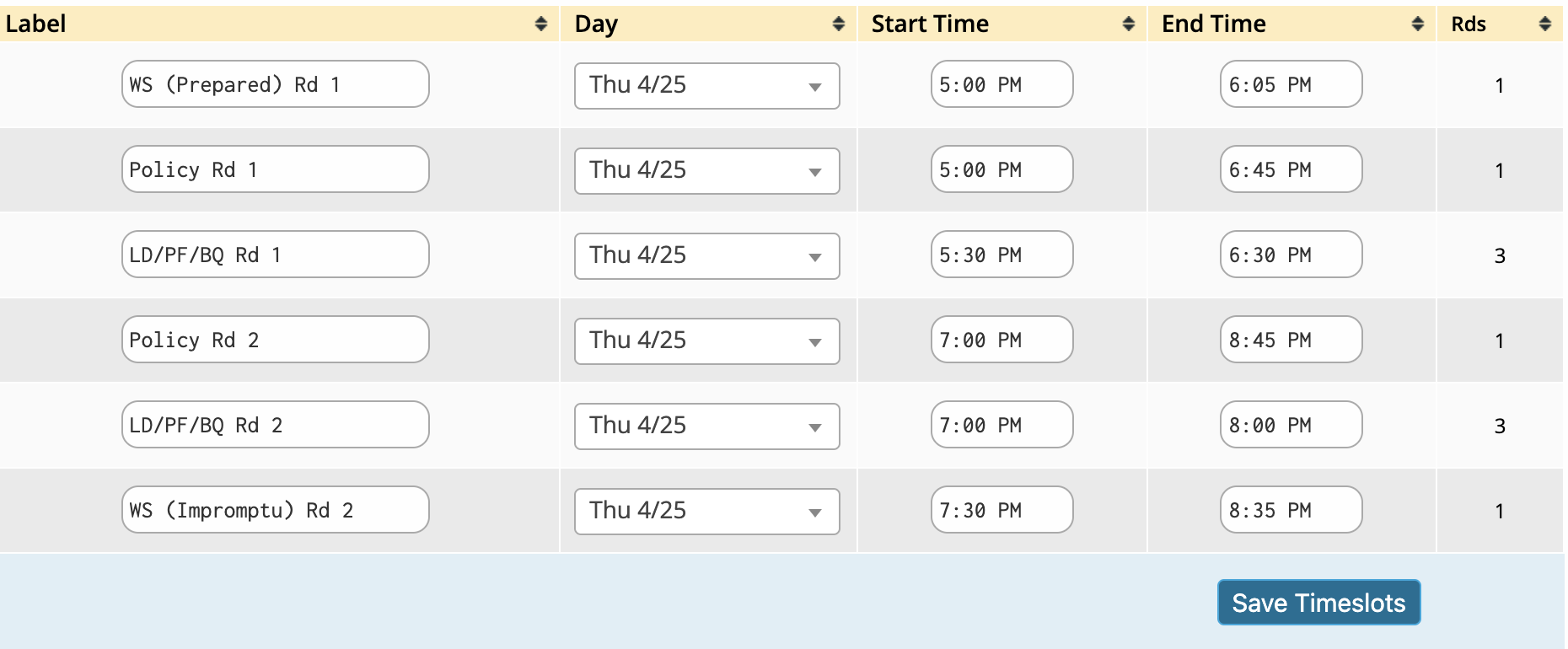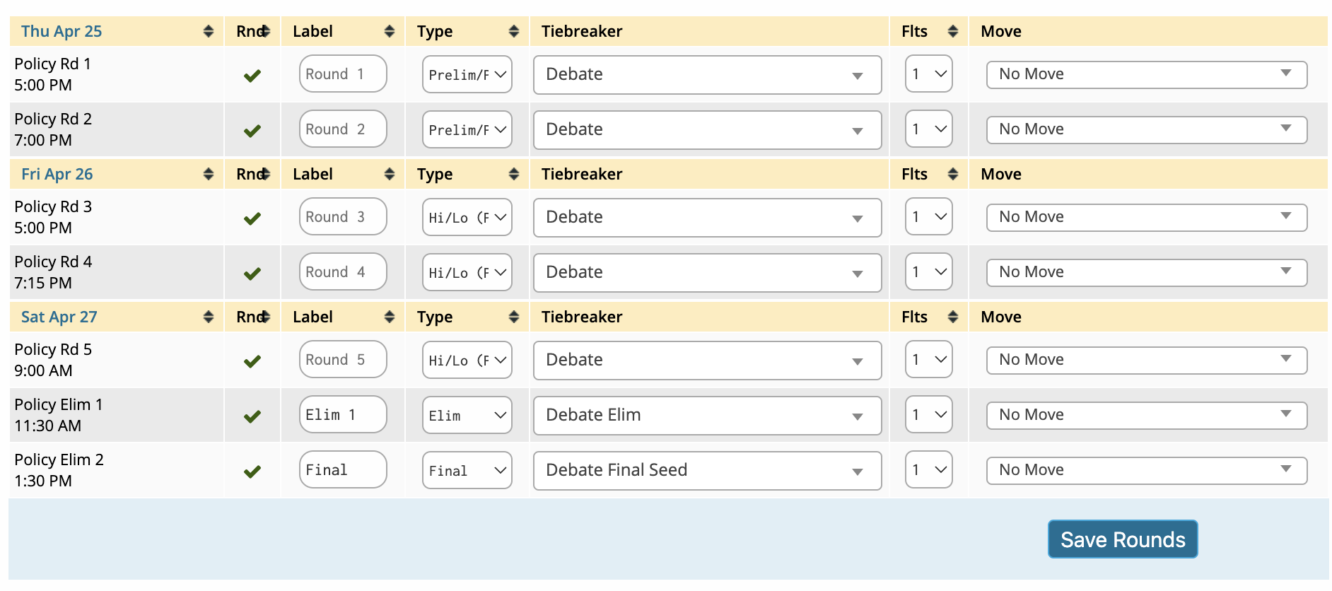 Move - This dropdown will list the other open timeslots. Selecting a timeslot from this dropdown will move your label, round type, and tiebreaker to the new timeslot.