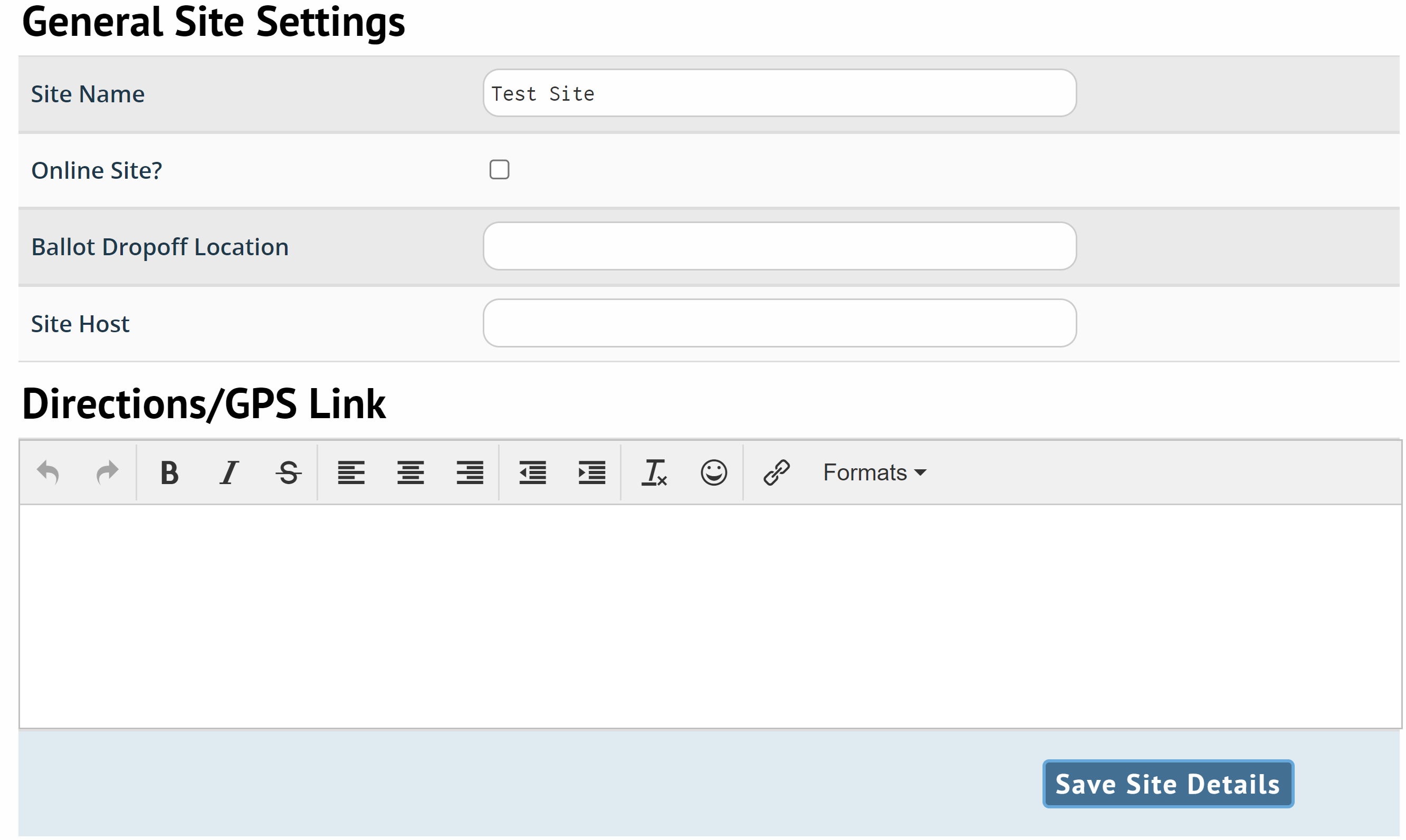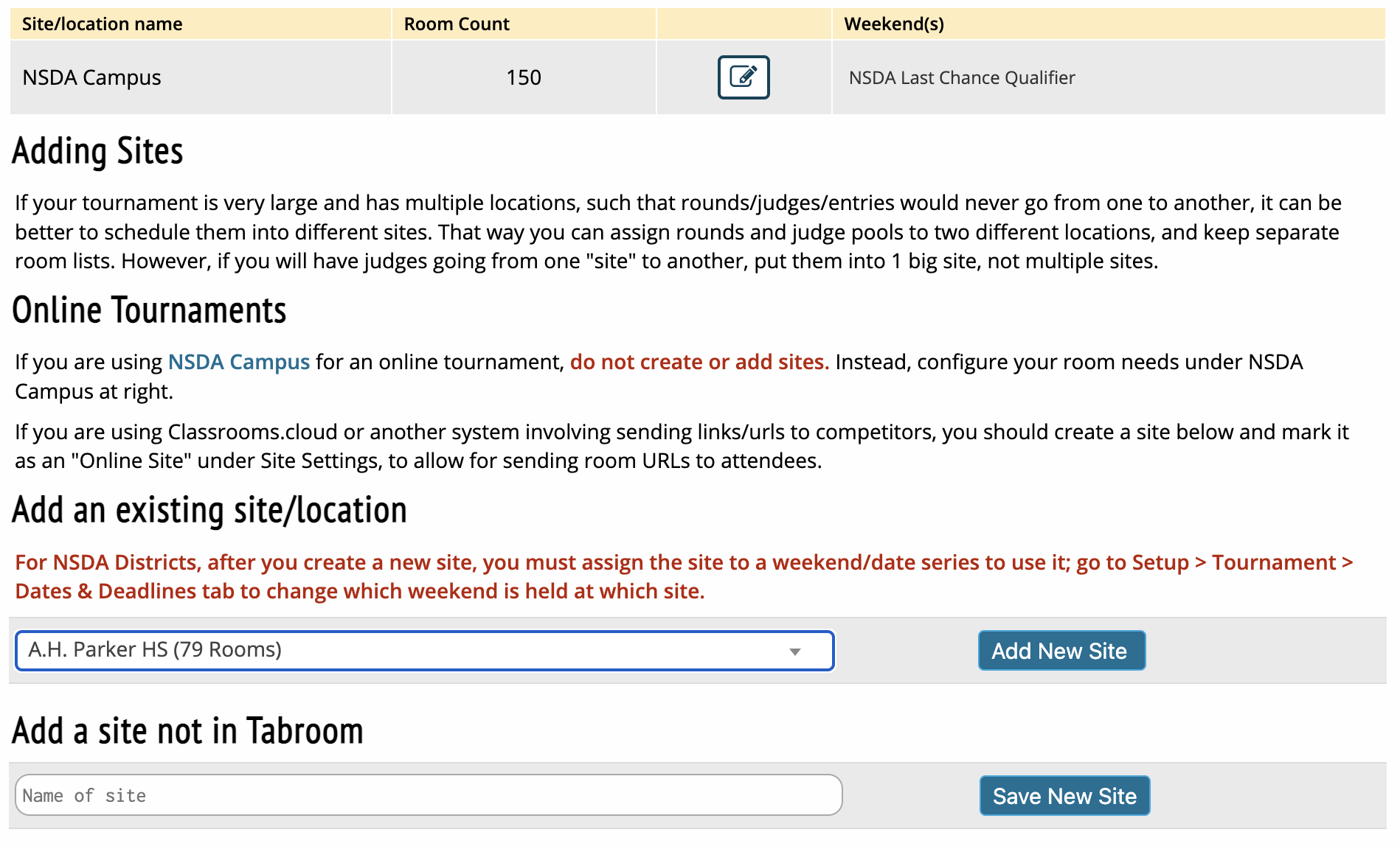Add an existing site/location - Dropdown menu to select sites previously saved to Tabroom.